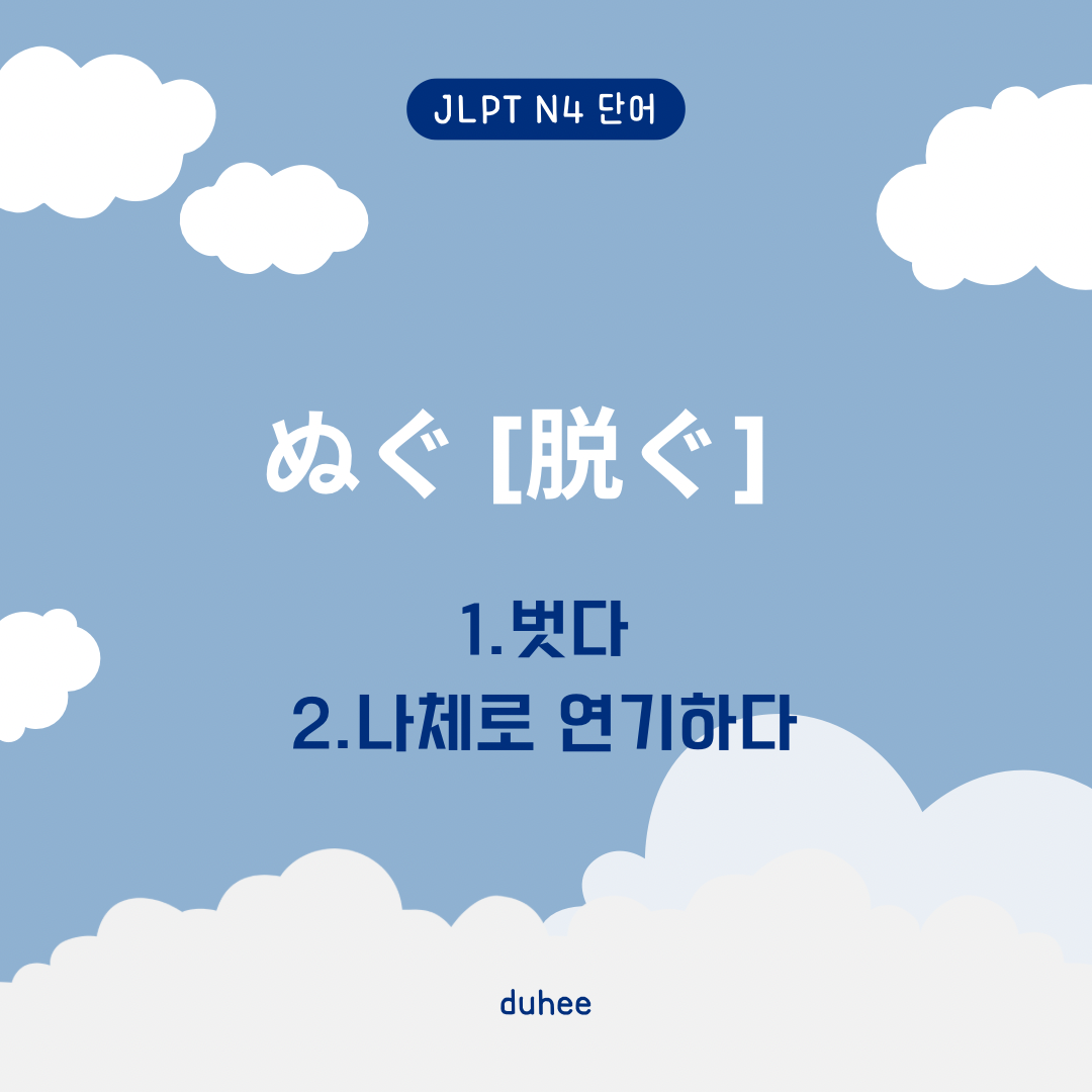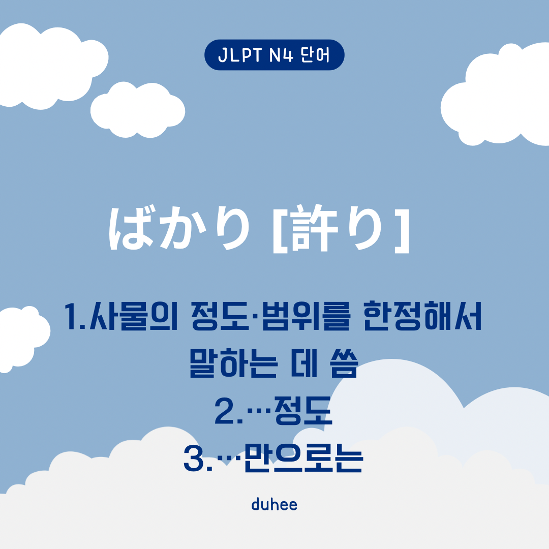 📖 두희의 오늘의 일본어 📖はんぶん [半分] 항붕1.반분2.반쯤3.반 … 삼아명사1.반분; 반; 절반.半分に切ったキャベツ 반으로 자른 양배추동의어 なかば2.(부사적으로도 씀) 반쯤; 어느 정도.半分眠っているような顔 반쯤 눈이 감겨 있는 것 같은[졸린 듯한] 얼굴3.(명사에 붙어) 반 … 삼아; 반은 …의 기분으로.面白半分 반장난; 농반진반https://www.instagram.com/duhee.inshttps://m.blog.naver.com/duhee_s2 ˚₊♡̷̷̷*‧₊˚duhee˚₊‧*♡̷̷̷₊ ˚ : 네이버 블로그당신의 모든 기록을 담는 공간m.blog.naver.com